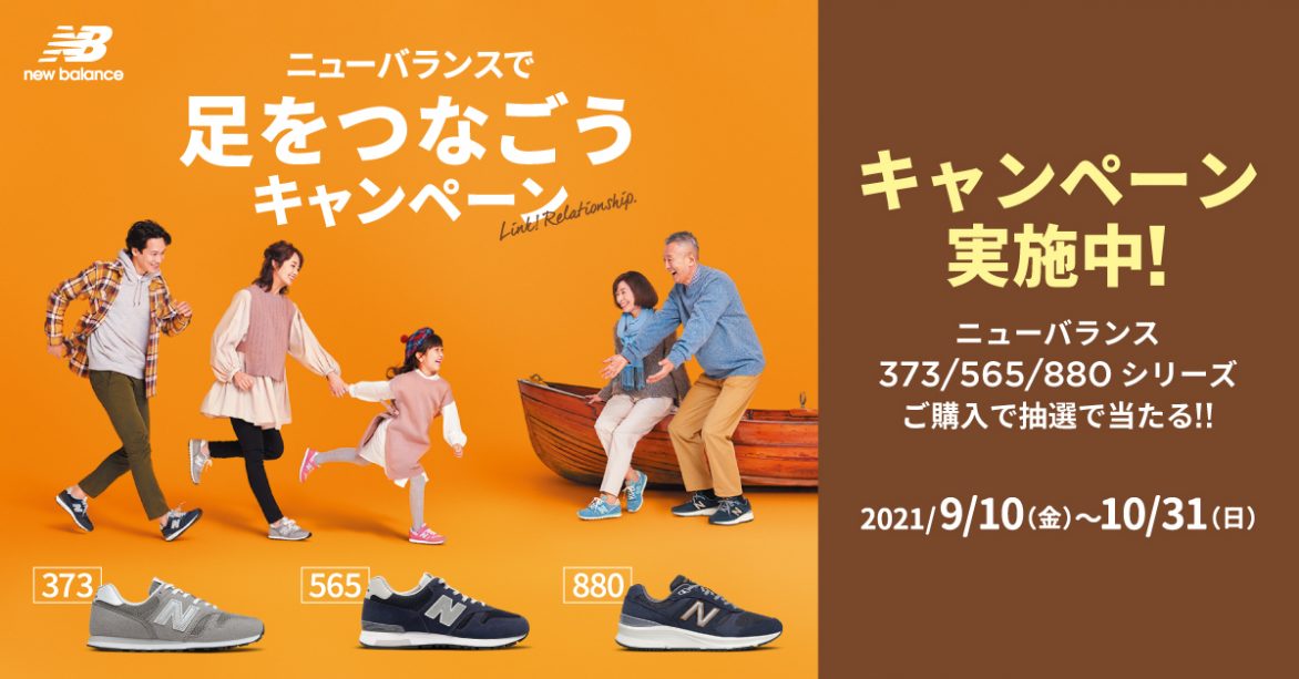 この秋、続々と新作が登場するニューバランスシューズ。親子でお揃いを楽しめる「373」や、伝統的なランニングスタイルを継承した「565」、ウォーキングが楽しくなる「880」シリーズなど、豊富なバリエーションをご用意しています。ニューバランスは、9月10日(金)より「ニューバランスで足をつなごう」キャンペーンを実施します。10月31日(日)までにニューバランスの「373」、「565」、「880」シリーズ※を対象店舗にてご購入いただいたお客様の中から抽選で“家族をつなぐ”グッズが当たります。(※セール品を含みます。FRESH FOAM 880は除く。) キャンペーンサイト:https://www.