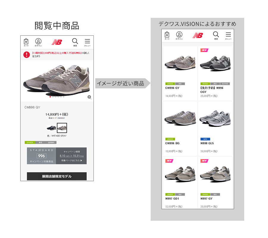 株式会社ニューバランス ジャパン(本社:東京都千代田区、代表取締役社長:久保田 伸一)は、ニューバランス公式オンラインストアにサイジニア株式会社(本社:東京都港区、代表取締役CEO:吉井伸一郎)が提供するビジュアルレコメンデーションツール「デクワス.VISION」を導入いたしました。