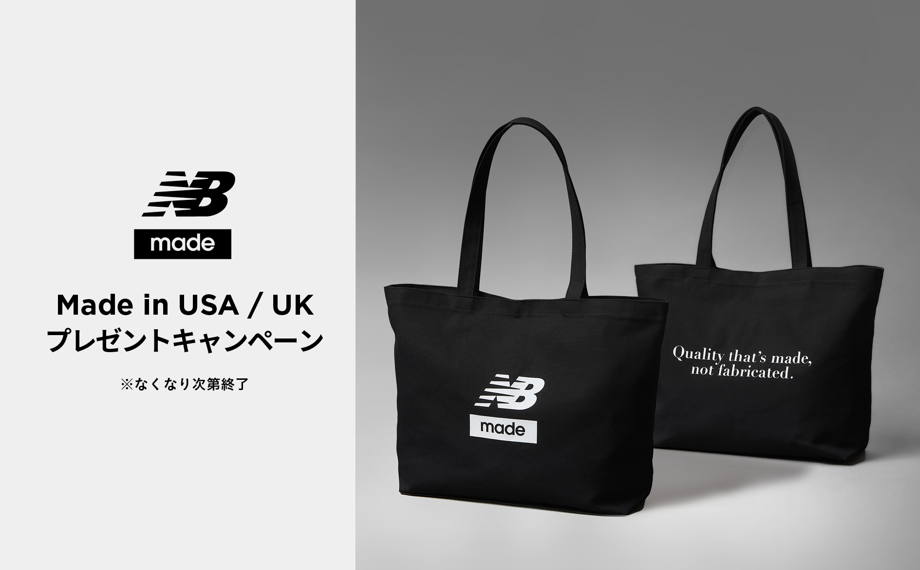 ニューバランス公式オンラインストア及びニューバランスオフィシャルストアにて、本日からMade in U.S.A./U.K.商品1点を含む合計35,000円(税込)以上ご購入いただいたお客様に先着でMade in U.S.A.のオリジナルトートバッグをプレゼントいたします。トートバッグはW53cm×H35cm×D12.7cmの大きめサイズかつ厚手な生地感のためショッピング時など幅広いシーンでお使いいただくことが可能です。