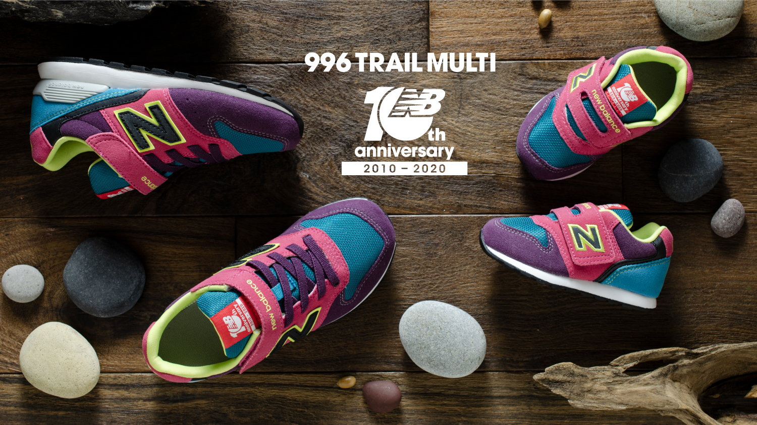ニューバランスキッズの人気モデル「996」のインファント、キッズバージョンから、2010年秋冬シーズンにリリースされ好評を博した“トレイルマルチカラー”を復刻した10周年アニバーサリーモデルが登場しました。足元をビビッドに彩るアウトドアカラー、10周年を祝したタンラベルとともに、特別な1足に仕上がりました。ニューバランスオフィシャルストア、ニューバランス公式オンラインストアでは9月25日(金)に発売いたします。その他全国のニューバランスキッズ販売店舗でも随時発売予定です。