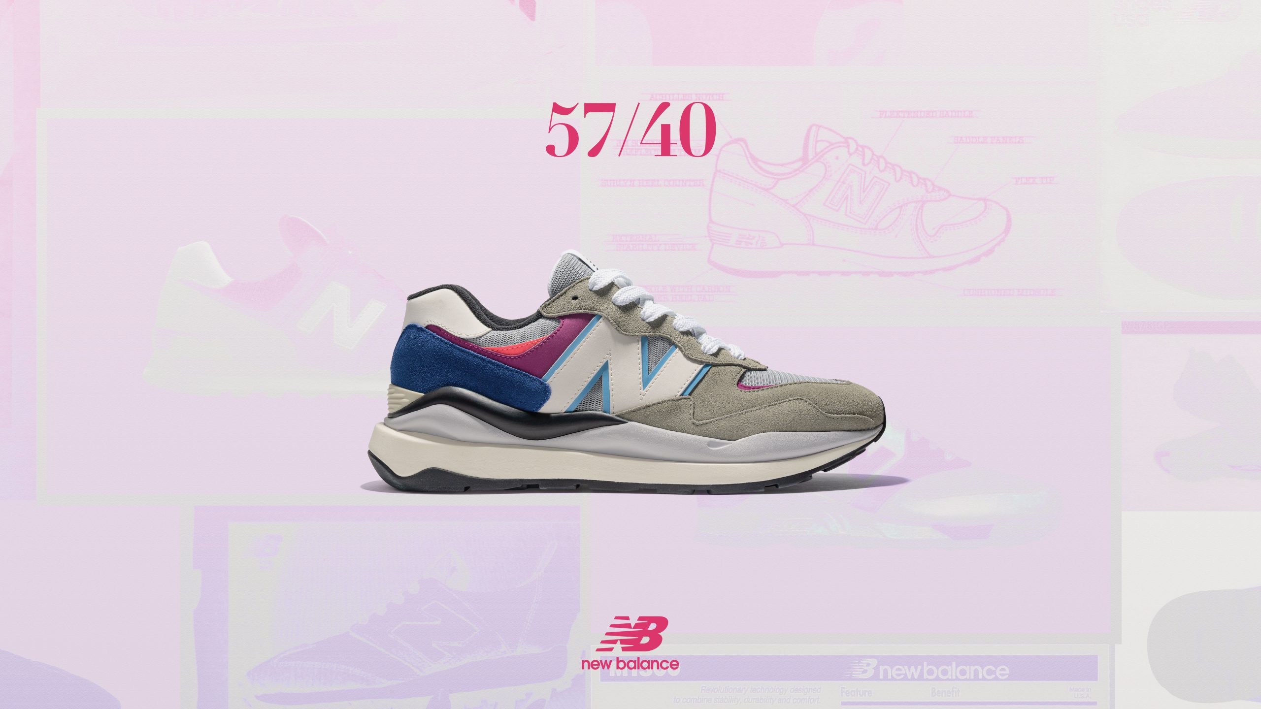 80年代に誕生したオフロードシューズ576のDNAを引き継ぎ登場したアイコニックモデル「574」と90年代のウェービーなデザインからインスピレーションを、現代へシフトさせ誕生した「57/40(フィフティセブン/フォーティ)」にニューカラーが2色登場。“Decades Clash”と名付けられたこの2色はニューバランスの過去の歴史的なモデルを象徴するカラーを組み合わせて誕生。8月14日(土)よりニューバランス公式オンラインストア、ニューバランスオフィシャルストア、その他一部店舗にて販売いたします。
