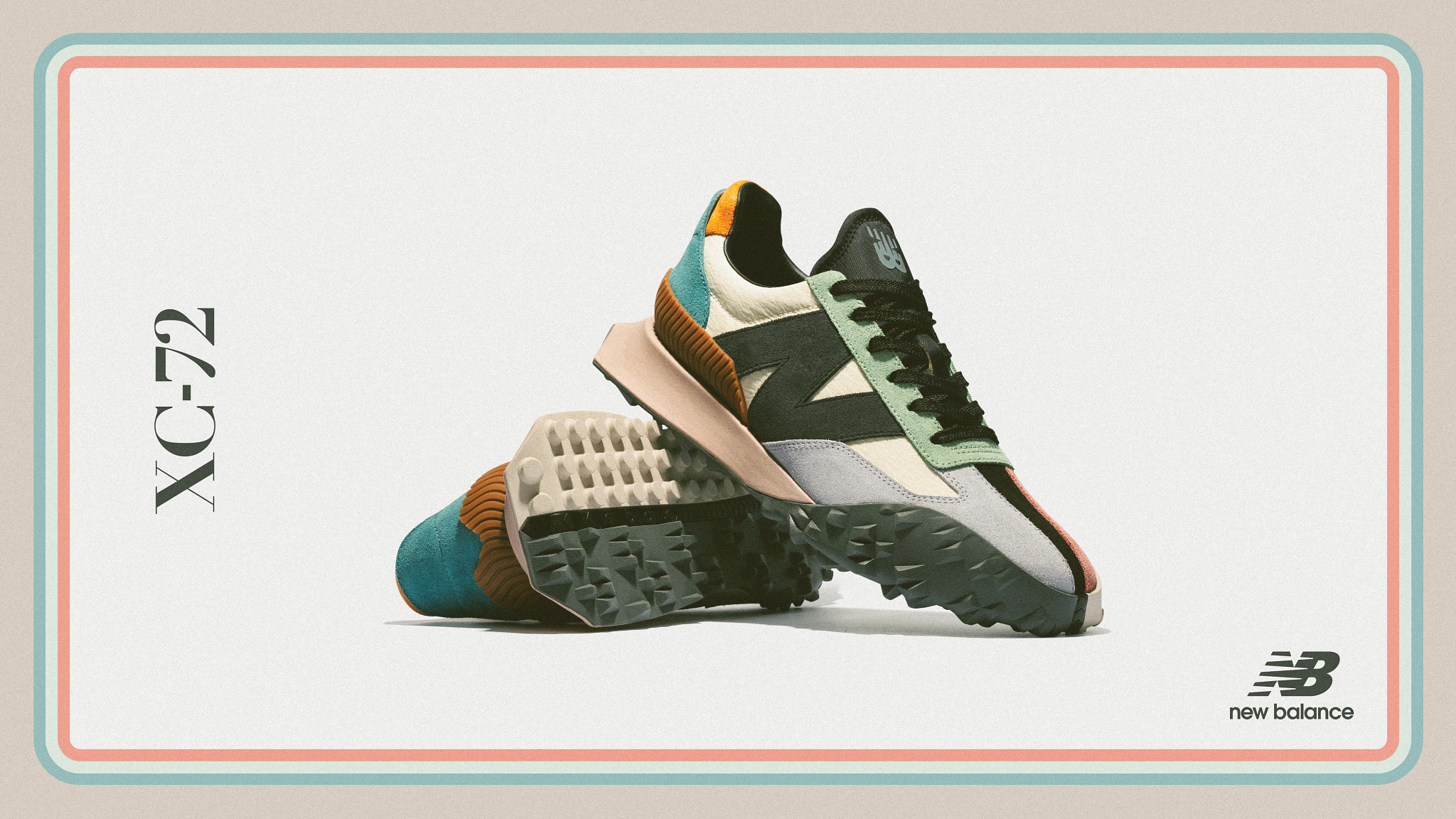 「XC-72」は、内外異なるアシンメトリーなアウトソールパターン、多角的にシェイプされたヒール、70年代のコンセプトカーから着想を得たスクエアトゥなどのディテールを採用し、インパクトのある現代的デザインでありながらノスタルジーを感じさせるルックが特徴。昨年デビューし、瞬く間にニューバランスの人気モデルの1つとなった「327」と同様、過去のアーカイブモデルと、現代のトレンドを掛け合わせ再構築した時代を超越するデザインです。「Casablanca(カサブランカ)」とのコラボレーションモデルに次ぎ、「XC-72」の第二作目となる今作は、クロムフリーのスエードとナイロンのコンビネーションが目を引くアッパーに、レトロフューチャーなイメージアートから着想を得たカラーリングを配した一足です。