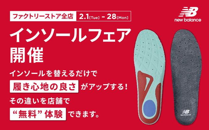 ニューバランス ファクトリーストア全店にて、2月1日(火)から2月28日(月)まで、「インソールフェア」を開催いたします。ニューバランスは1906年に矯正靴やアーチサポートインソールの製造メーカーとして誕生して以来、シューズの履き心地や機能性を追求してきました。インソールはシューズ着用時の安定性を向上したり、フィット感をより高めたりすることができます。今回のインソールフェアではお客様に合わせたインソールをご提案いたします。ご体験は無料です。ぜひその履き心地の良さをお試しください。