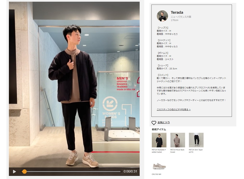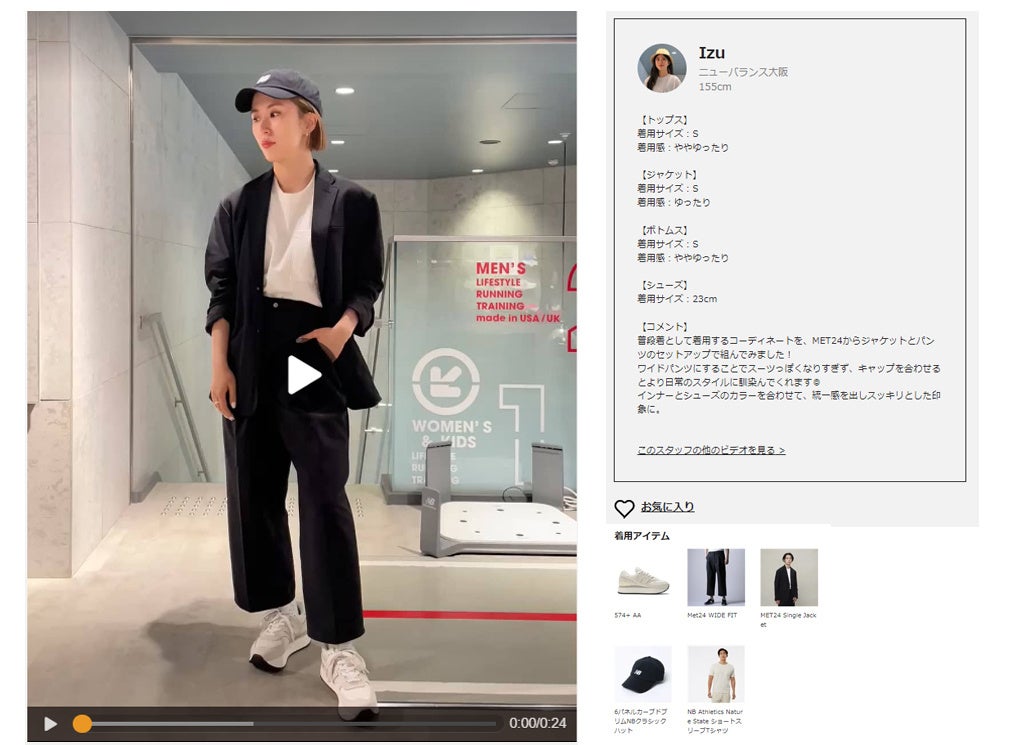 店舗スタッフから公式オンラインストアに投稿されたスタイリングのビデオ(動画投稿機能)が見られるようになり、モデルが着用しているアパレルやシューズをさまざまな角度で確認できることにより、従来の静止画以上に情報お届けできるようになりました。スタイリングの詳細な使用感やサイズ感、素材の質感もチェックでき、お客様にもっと身近に楽しく公式オンラインストアでのお買い物を体感頂けるコンテンツとなっております。