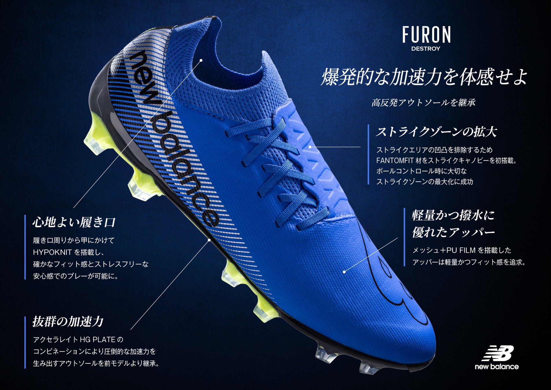 ストライカー向けスピードモデル。NBランニングスパイクから着想を得たロープロファイルデザインのもと、DESTROY HGは軽量なメッシュアッパー、ボールとの接地面をクリーンにする甲部キャノピー構造、スピードに加速度をつけるHGソールを採用。疾走感あふれる鮮烈なブルーを、足入れのしやすい2Eウイズで展開します。