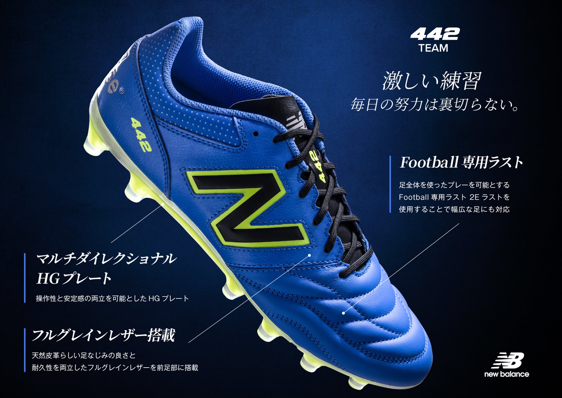 [ダイアグラム 自動的に生成された説明] 快適なフィットでパフォーマンスアップに貢献する「442」のミドルレンジモデル。フルグレインレザーが、天然皮革の足馴染みのよさと優れた耐久性を発揮。心地よいフィット性、グリップ性に優れたHGソールとともに、練習から試合まで幅広く活躍します。足入れのしやすい2Eウイズ展開です。
