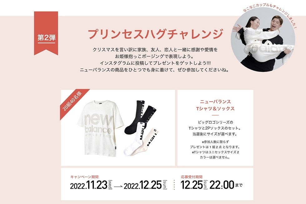 クリスマスを言い訳に家族、友人、恋人と一緒に感謝や愛情をお姫様抱っこポージングで表現しよう。ニューバランスの商品をひとつでも身に着けて、インスタグラムに投稿しプレゼントをゲットしよう!