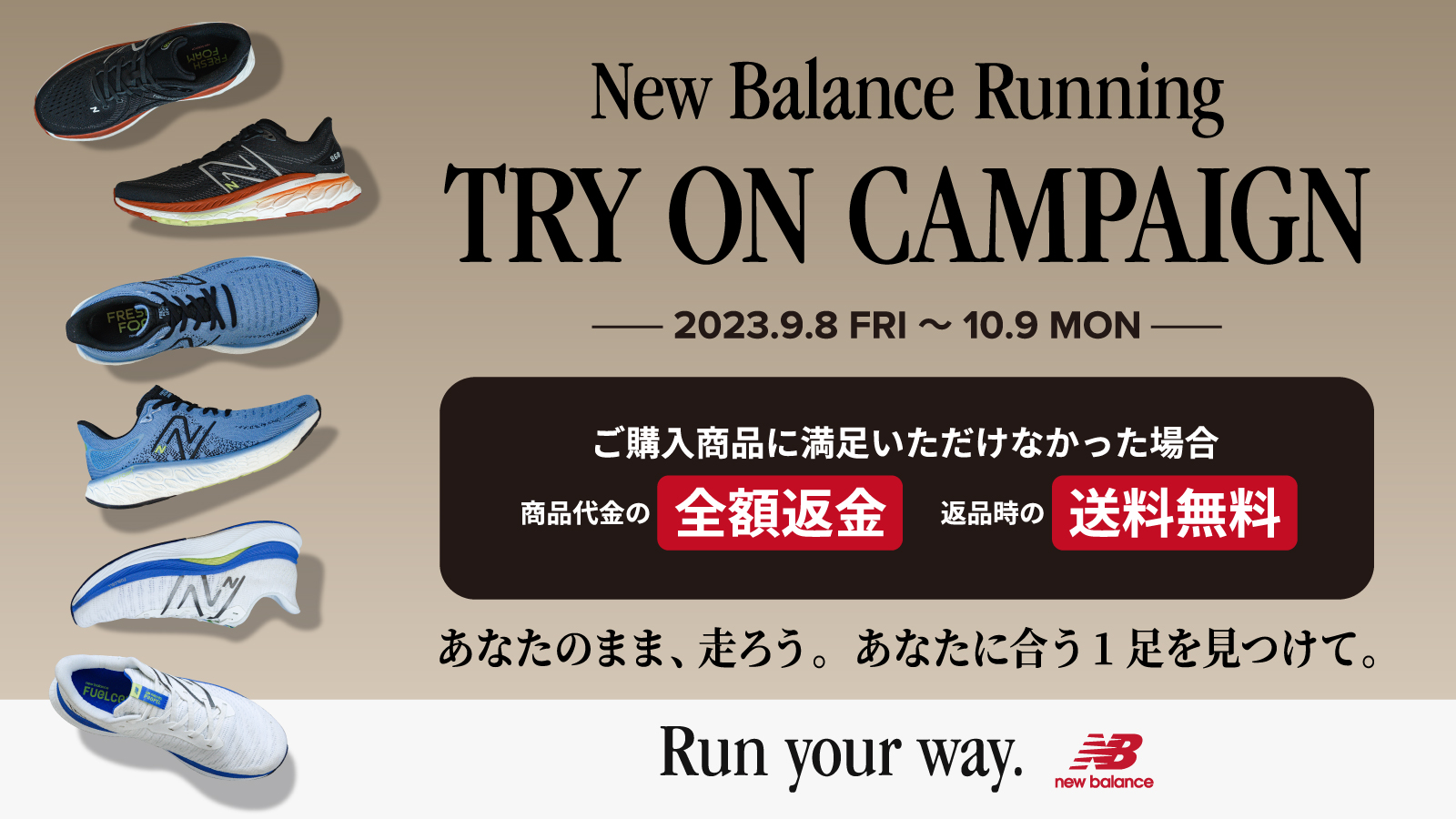 記録にチャレンジする人、自分のペースで楽しむ人、すべてのランナーを尊重し、それぞれの走りを応援する想いを込めて、「New Balance Running TRY ON CAMPAIGN(ニューバランスランニングトライオンキャンペーン)」を開催します。9月8日(金)~ 10月9日(月)のキャンペーン期間中に対象商品を対象店舗で、ご購入いただき、ご購入シューズに満足いただけなかった場合、商品代金の返金と返品時の送料が無料となるキャンペーンです。ぜひこの機会にニューバランスランニングシューズの履き心地、走り心地をお試しください。