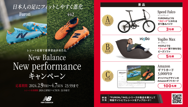 ニューバランスジャパンは、全国のシューズ・スポーツショップ対象店舗にて、ニューバランスフットボールシューズのストライカー向けスピードモデル「Furon v7+」と、最上級の履き心地と安定性が特徴の「442 v2」のスパイク、TF(トレーニングシューズ)を購入すると、豪華賞品を抽選でプレゼントする「New Balance New Performance キャンペーン」を開催します。