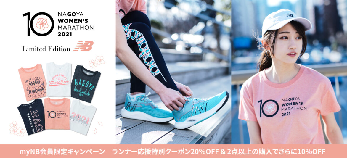ニューバランス ジャパンは、2021年3月14日(日)に開催される「名古屋ウィメンズマラソン2021」(同時開催の「名古屋シティマラソン」「名古屋ウィメンズホイールチェアマラソン2021」を含む)にシルバースポンサーとして協賛いたします。大会開催を祝し、大会限定コレクションをニューバランス公式オンラインストア、ニューバランス名古屋にて限定発売。また、新規入会の方を含むmyNB会員限定で、本コレクションをご購入の際に使用できる「ランナー応援特別クーポン 20%OFF・2点以上の購入でさらに10%OFF」をプレゼントします。約1か月後に迫る大会に向け、気分があがる限定コレクションで備えませんか。h