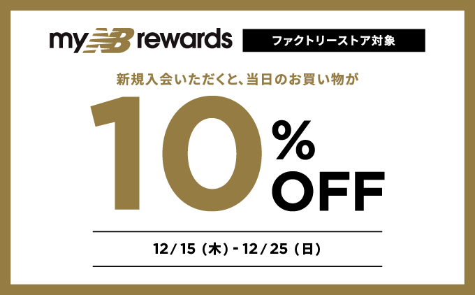 ニューバランスのロイヤリティプログラム「myNB」に入会いただけると、当日のお買い物が10%OFFでご購入できるキャンペーンを期間限定で実施いたします。 「myNB」は、お客様とニューバランスをつなぐ、登録無料の会員ロイヤリティープログラムです。 myNB会員様限定のセールのご案内やメールマガジンでお得な情報をお届けいたします。 myNBについての詳細はこちらから【期間】 12/15(木)~12/25(日)【対象店舗】ファクトリーストア全店【注意点】・オフィシャルストア、コンセプトストア、ポップアップストアでは開催しておりません。・既にmyNB会員へご入会いただいているお客様は、対象となりませ