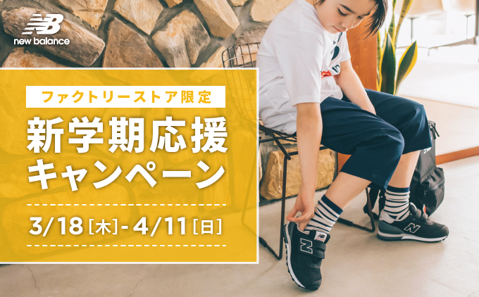 3/18(木) – 4/11(日)の期間中、ニューバランスファクトリーストア全店で新学期応援キャンペーンを開催いたします。キッズシューズ含む8,000円(税込)以上ご購入のお客様に先着でオリジナルキッズバッグをプレゼント! この機会をぜひお見逃しなく! キャンペーン詳細 【キャンペーン期間】3/18(木) – 4/11(日) 【対象店舗】ファクトリーストア全店【対象者】キッズシューズ含む8,000円(税込)以上ご購入のお客様【ご注意点】■無くなり次第終了とさせていただきます。■ファクトリーストア限定のキャンペーンとなります。※ニューバランス公式オンラインストア、オンラインアウトレット、オフィシ
