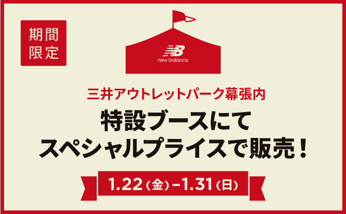 1/22(金) -1/31(日)の期間限定、三井アウトレットパーク 幕張内特設ブースでこれからの季節に重宝するアイテムを、スペシャルプライスにて販売いたします! 特設ブース開催情報 【場所】三井アウトレットパーク幕張 Cサイト ユナイテッドアローズ前【開催日】1/22(金) - 1/31(日)【開催時間】10:00 - 20:00【シューズ情報】MAX60%OFFとお買い得品を多数ご用意。【アパレル情報】MAX80%OFF 500円/1,000円/2,000円/3,000円均一にて、冬の寒い日も活躍するアイテムをご用意。ニューバランスファクトリーストア幕張(常設店)はこちらからスタッフ一同、ご