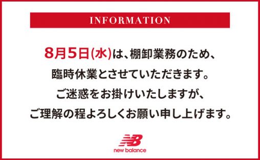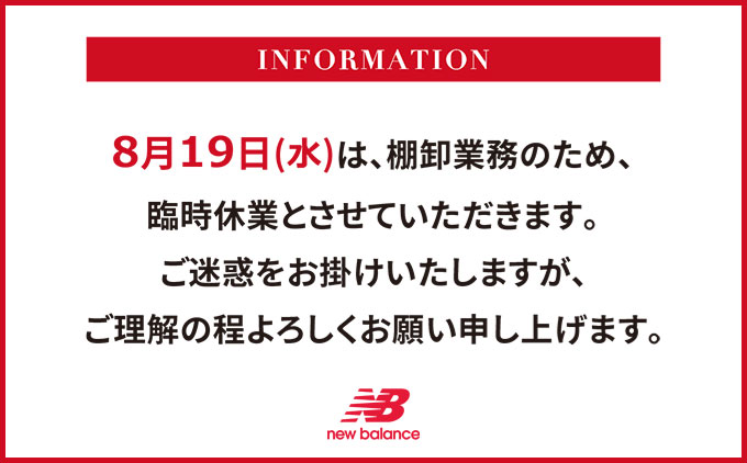 2020.08.12 8/19(水)大阪店 棚卸しのため臨時休業 ニューバランス大阪は下記日付を、棚卸業務のため臨時休業とさせていただきます。お客様には大変ご迷惑をお掛けいたしますが、何卒ご理解賜ります様お願い申し上げます。 臨時休業:2020年8月19日(水)
