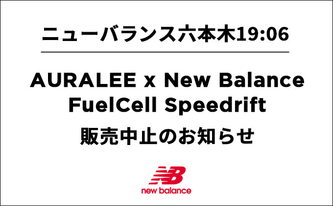 8月15日(土)に発売を予定しておりました「AURALEE × New Balance FuelCell Speedrift」につきまして、諸般の事情に伴い、ニューバランス六本木19:06での発売を中止させて頂くこととなりました。 なお、下記店舗は予定通り発売いたします。■AURALEE ONLINE STORE https://auralee.jp/online■ニューバランス公式オンラインストア https://shop.newbalance.jp/shop/■T-HOUSE New Balancehttps://company.newbalance.jp/store/concept-st
