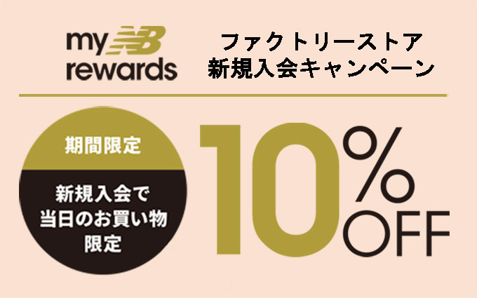 my NB新規入会 10%OFFキャンペーン開催 ニューバランスのロイヤリティプログラム「my NB」に入会いただけると、当日のお買い物が10%OFFでご購入できるキャンペーンを期間限定で実施いたします。 「my NB」は、お客様とニューバランスをつなぐ、登録無料の会員ロイヤリティープログラムです。my NB会員様限定のセールのご案内やメールマガジンでお得な情報をお届けいたします。my NBについての詳細はこちらから 期間:11/11(月)~11/30(土) 対象店舗:ファクトリーストア全店