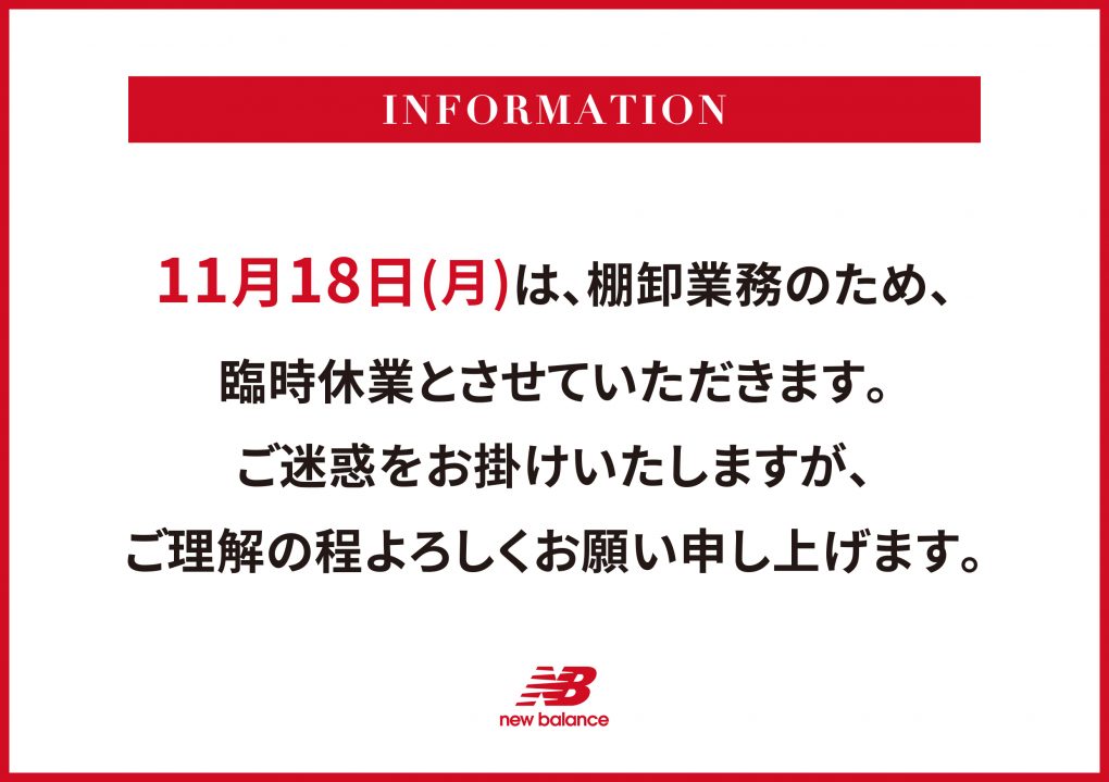 2019.10.24 11/18(月)銀座店 棚卸しのため臨時休業 ニューバランス銀座は下記日付を、棚卸業務のため臨時休業とさせていただきます。お客様には大変ご迷惑をお掛けいたしますが、何卒ご理解賜ります様お願い申し上げます。 臨時休業:2019年11月18日(月)