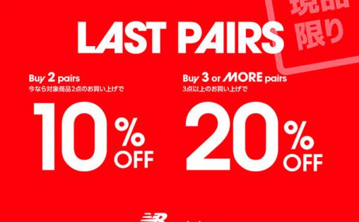 セール期間中のおトクなキャンペーンをご紹介! 現品コーナーのシューズはまとめ買いがおトク。2点お買上げで10%OFF、3点以上でなんと20%OFFです!掘り出しものを見つけるチャンスです! その他オススメのモデルをピックアップ! JMTL6922(左)・JMTL6926(中央・右) PRICE:2,900円+税 夏の定番、ポロシャツもお買い得です!父の日ギフトとしてもぜひ! MW505(メンズ) PRICE:アウトレット価格 足に優しいニューバランスならではのウォーキングシューズが期間限定値下げ! WL574(ウィメンズ) PRICE:アウトレット価格