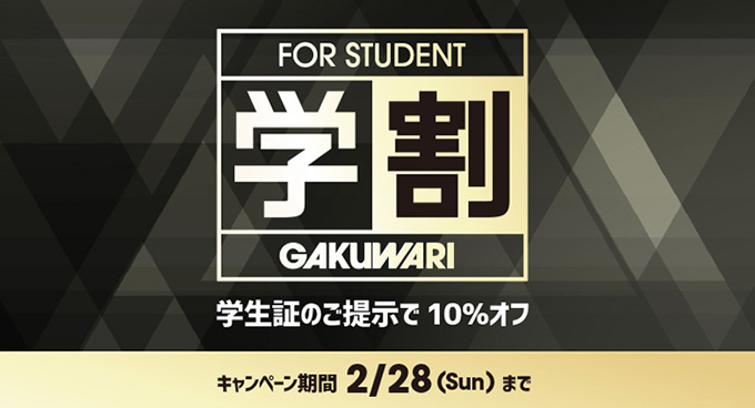 2016.02.10 「学割キャンペーン」2月15日(月)〜2月28日(日) ニューバランスファクトリーストアでは下記期間中「学割キャンペーン」がスタート!レジにて学生証提示で店頭表示価格より10%OFF!このおトクな機会に4月から始まる新年度に向けて新しいウェアやシューズを揃えてみてはいかがでしょうか? 学割キャンペーン 期間:2月15日(月)〜2月28日(日) ※一部対象外商品あり ※他の割引との併用はできません。 ※詳しくはスタッフにお尋ねください。