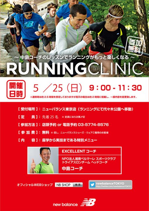 開催場所:ニューバランス東京→代々木公園 AM9:00〜AM11:30(雨天時はAM11:00迄) 毎回好評いただいております、ニューバランスランニングアドバイザー中島靖弘氏による ランニングクリニックの開催が決定いたしました!! 中島靖弘氏プロフィール 湘南ベルマーレスポーツクラブ トライアスロンチームヘッドコーチ 日本トライアスロン連合 マルチスポーツ委員長 オリンピック選手をはじめ、多くのアスリートのフィジカルトレーナーとして活躍中!! 疑問点や改善したい点など中島氏に直接投げかけられる良い機会。 体や走り方・トレーニング方法に悩みを抱える方も多いですよね。 初心者の方はもち