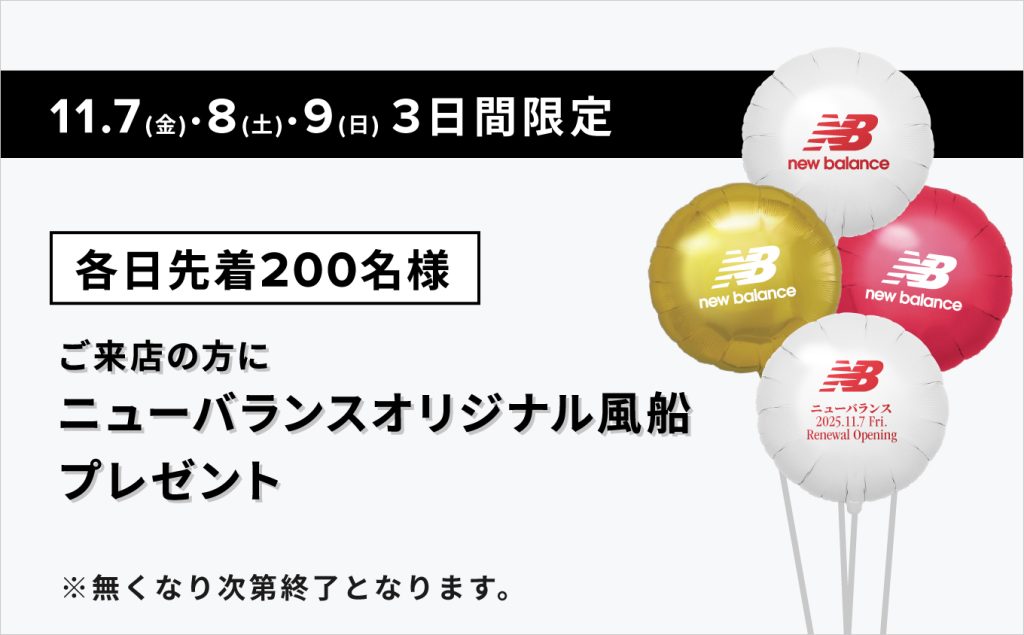 11月7日(金)・8日(土)・9日(日)の3日間限定で、ご来店のお客様にニューバランスオリジナル風船を、各日先着200名様にプレゼントいたします。