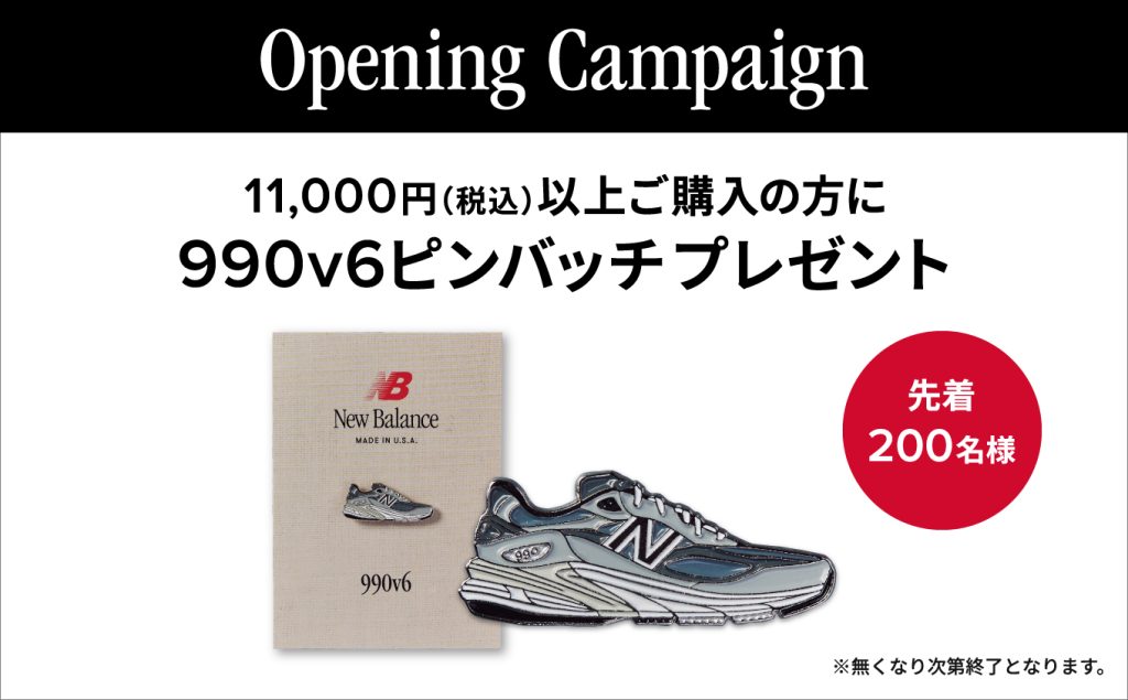 グランドオープンを記念し、11,000円(税込)以上購入で、先着200名様オリジナル990v6ピンズプレゼントいたします。