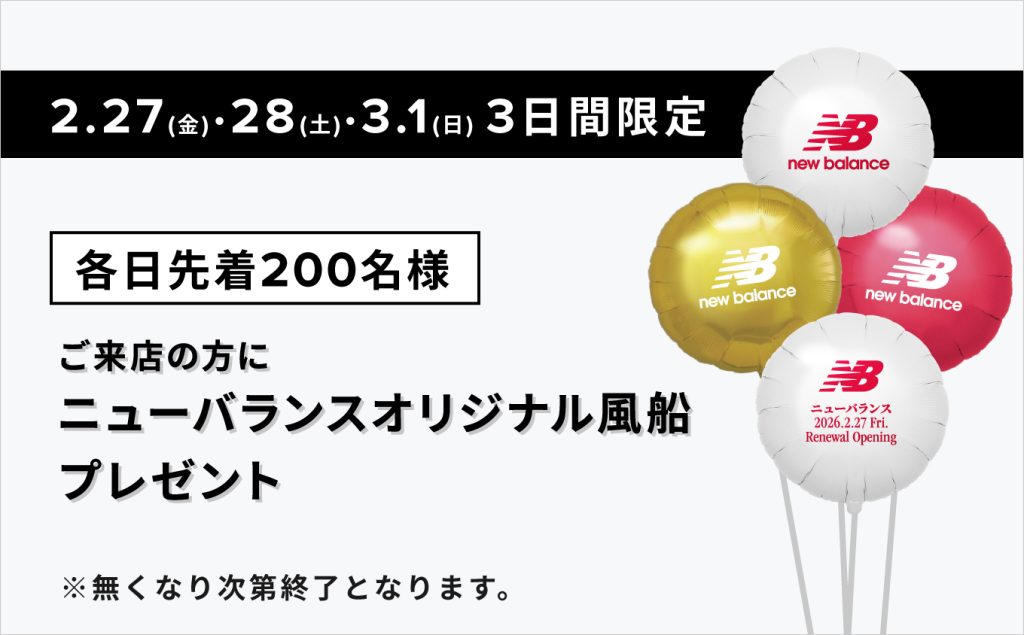 2月27日(金)・28日(土)・3月1日(日)の3日間限定で、ご来店のお客様にニューバランスオリジナル風船を、各日先着200名様にプレゼントいたします。