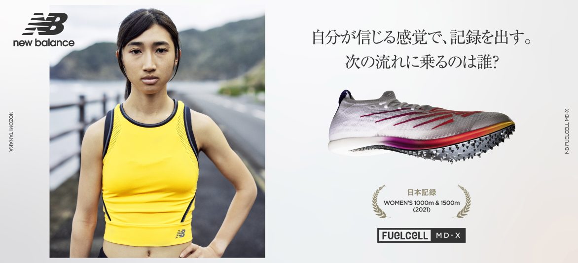 田中希実選手の2021年1000m、1500mの日本記録を支えた、ニューバランス史上初のカーボンプレート採用、トラックスパイク「FuelCell MD-X(フューエルセル エムディーエックス)」が登場。カーボンプレートとの相乗効果で推進力に加速度をつけるFuelCellソール、軽量化を推進する埋め込み型の6ピン、足と一体化するソックスタイプのニットアッパーを、明るくポジティブなVIBRANTカラーで彩り、ユニセックスサイズで展開します。「FuelCell MD-X」はニューバランス公式オンラインストアストア、SteP SPORTSにて4月14日(木)10:00より先行予約、ニューバランスオフィ